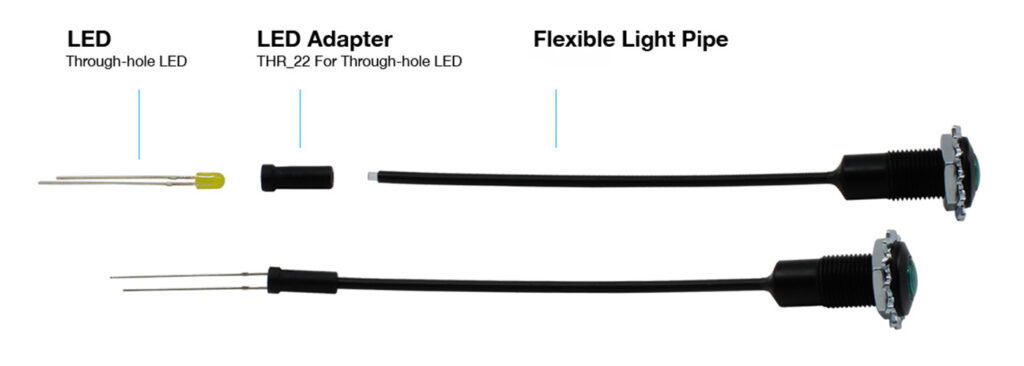 A flexible light pipe is preferred when light must be moved over longer distances or around obstacles between the LED and a front panel or other display location. A flexible light pipe assembly consists of an adapter, which provides less to no light bleed, and a flexible optical fiber with a lens cap. Flexible light pipes are immune to electromagnetic interference (EMI) and do not conduct or transfer electrostatic discharge (ESD) pulses.
