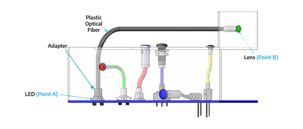 Flexible light pipes make it easy to add additional indicators or replace a damaged assembly because the lens cap at point B can be up to 330 feet from the LED light source at point A. The light pipe and lens need far less room near the panel face than the LED and its circuitry. If a human-factors engineer finds another indicator is necessary and space is an issue, a large redesign can be avoided by adding another indicator with a flexible adapter routed from another LED that may be in a completely different location from the first LED. The coupling of design time and design space radically improve cost concerns in a variety of industries and applications. Five different POF jacket colors improve installation and visual identification in the field by technicians, as well as clarify references in user manuals.